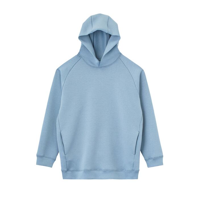 ポリジン加工を施したダンボールニット素材のプルオーバーパーカー。